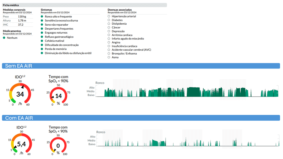 Os resultados com o EA Air 2 são mensuráveis e transformadores. Em casos acompanhados pela nossa equipe, observamos reduções drásticas nos índices de apneia e hipopneia.